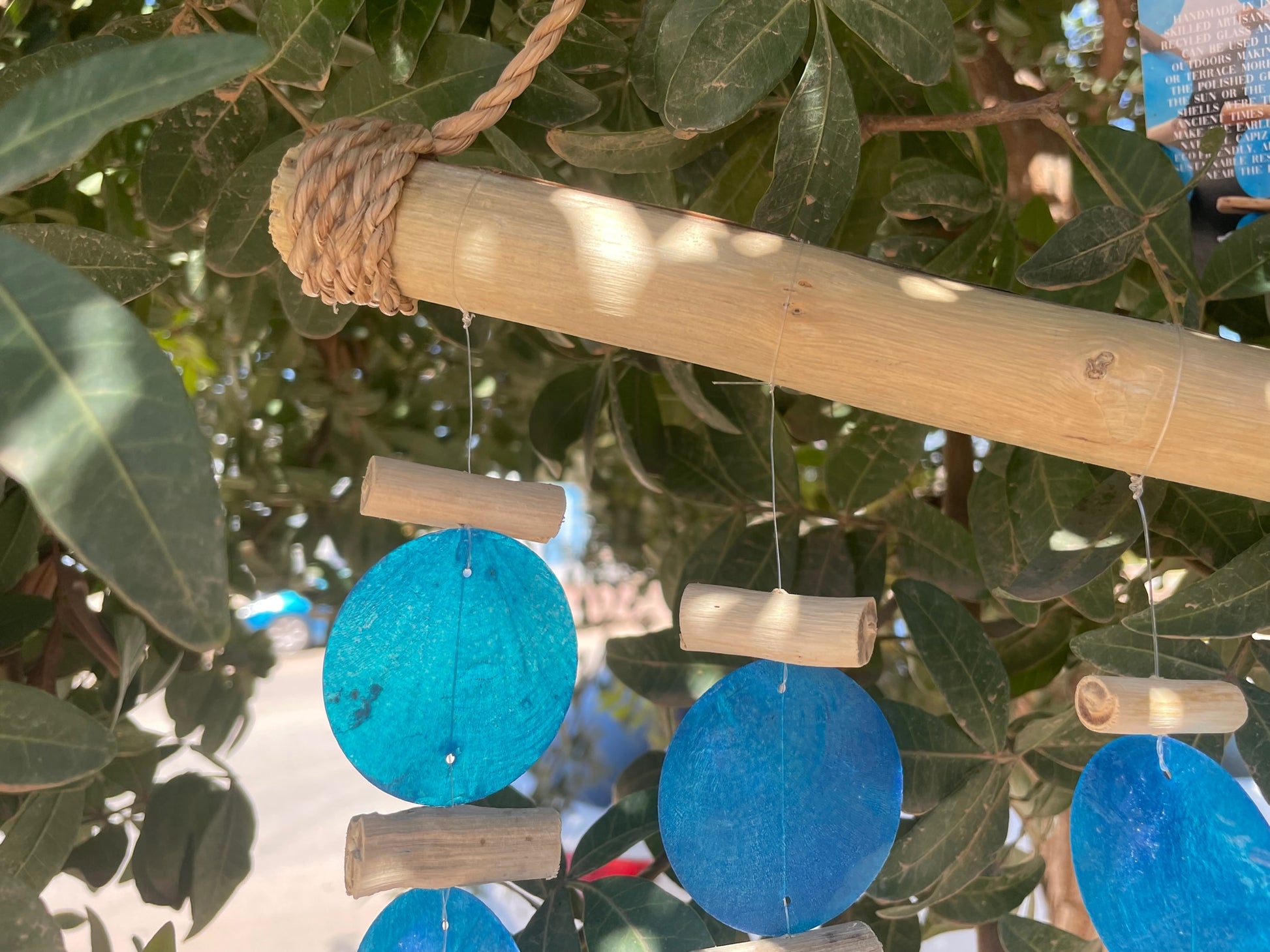 Este carillón de madera flotante en un elegante tono azul combina diseño artesanal y serenidad.