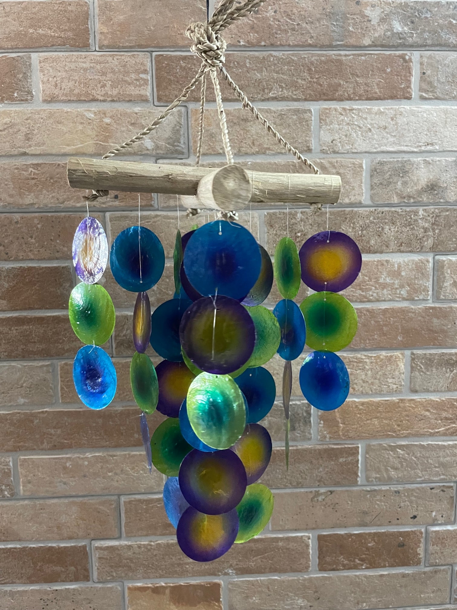 Este carillón de madera en tonos verde y morado, con diseño de cruz, aporta un toque único y armonioso a cualquier espacio.