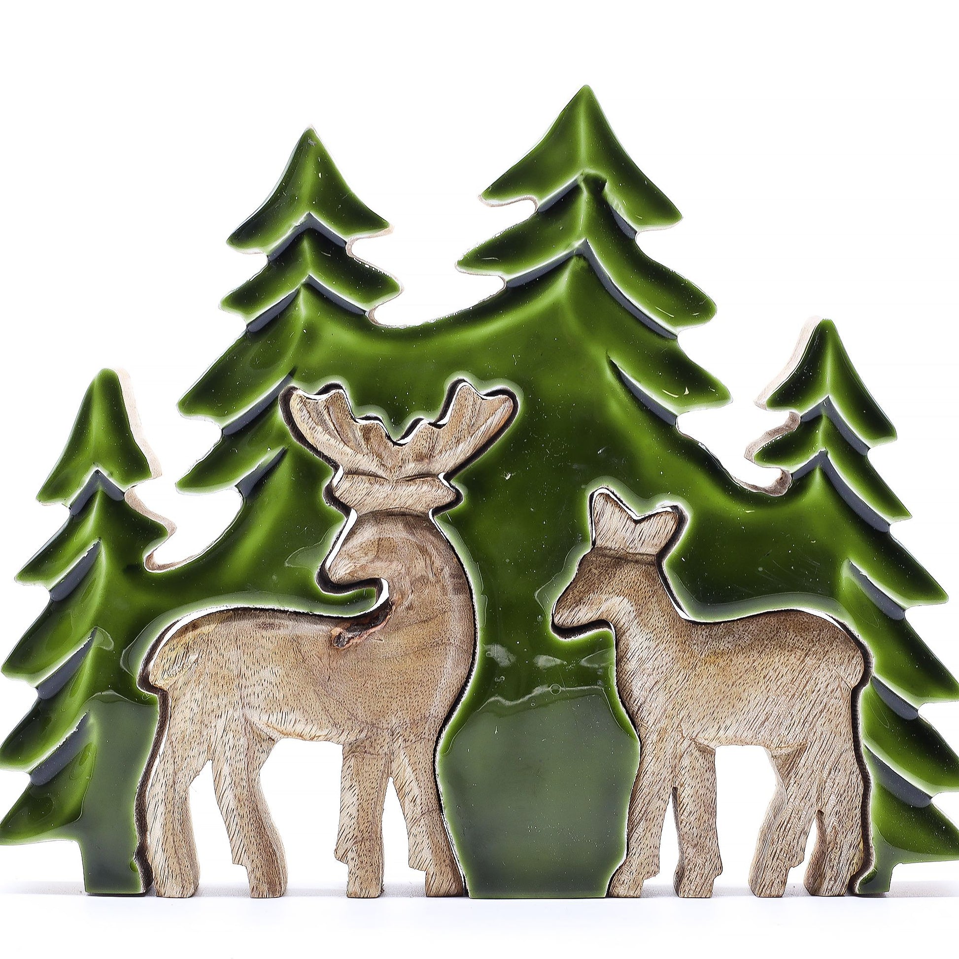 Tallado a mano en madera de mango sostenible y acentuado con esmalte verde intenso, esta escena del bosque presenta dos ciervos de pie, tranquilamente, entre altos abetos.