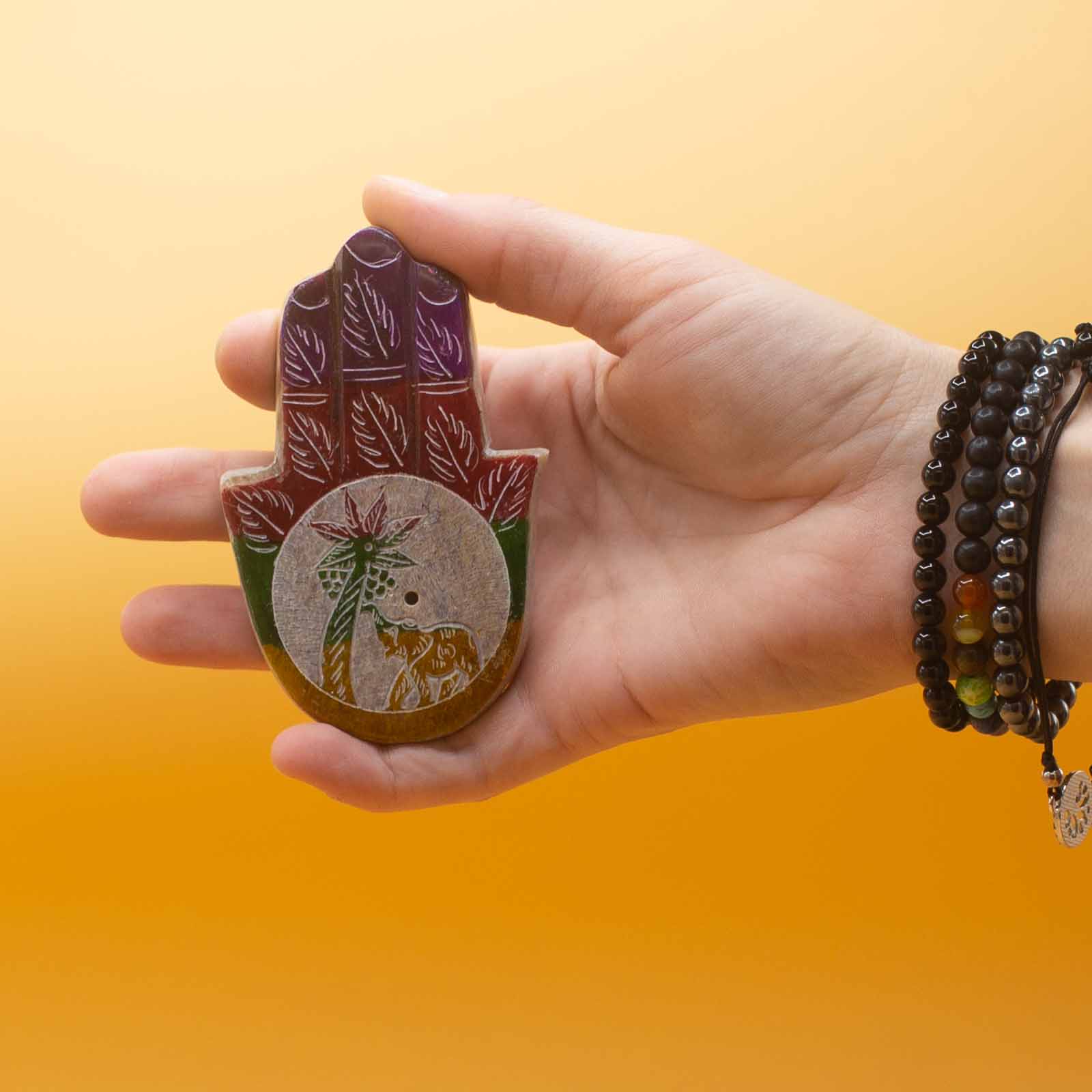 Este porta incienso de esteatita, con diseño de Hamsa, elefante y palma, mide 9x6 cm y combina belleza y funcionalidad.