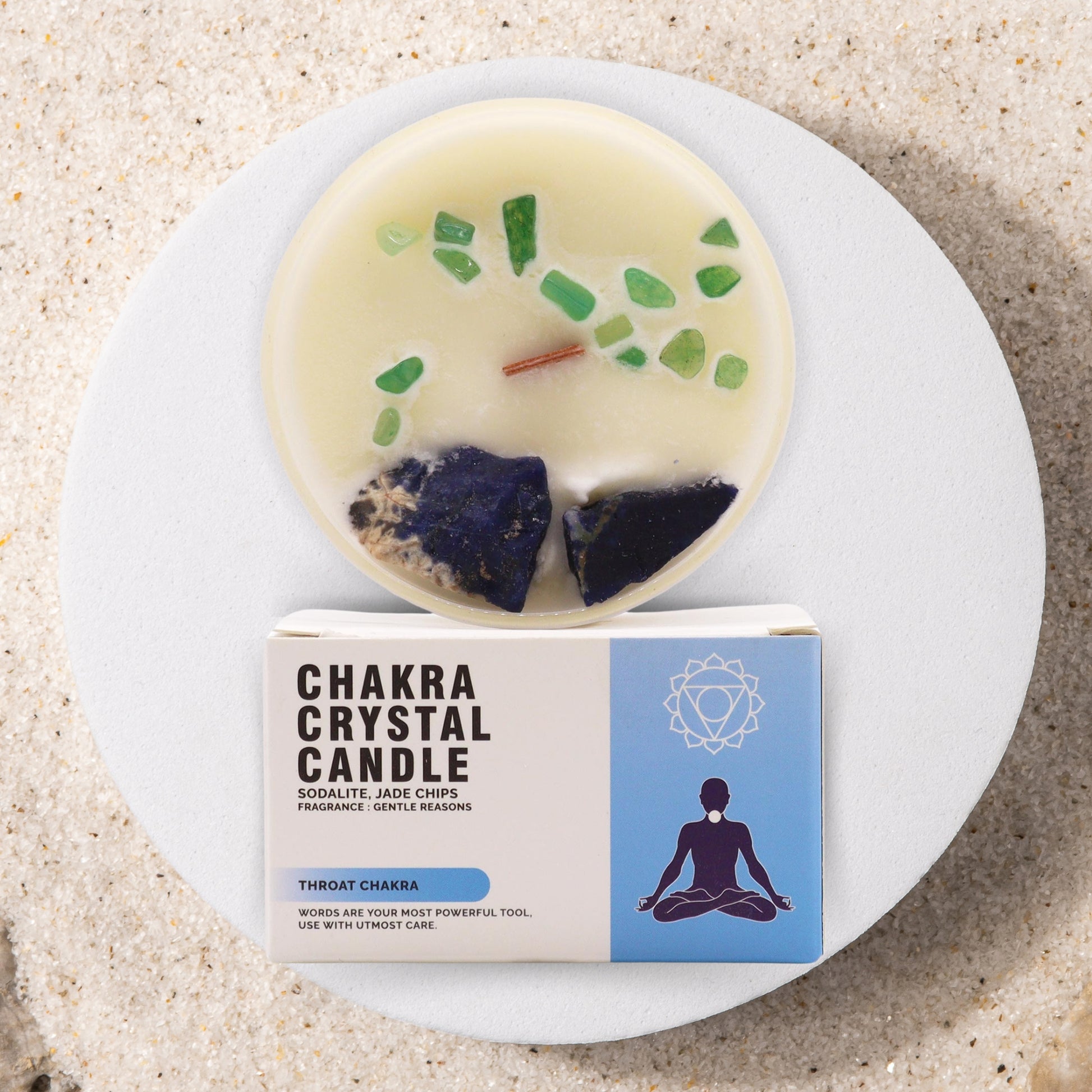 Nuestra vela del chakra de la garganta está fabricada con piedras preciosas reales, incluyendo sodalita y chips de jade, seleccionadas por sus propiedades energéticas.
